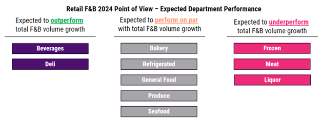 While declining inflation may cause food and beverage dollar sales growth to moderate in 2024, the new year is likely to bring volume growth to the grocery channel for the first time in three years, as long as the labor market remains strong. We do, however, expect performance to vary by category.